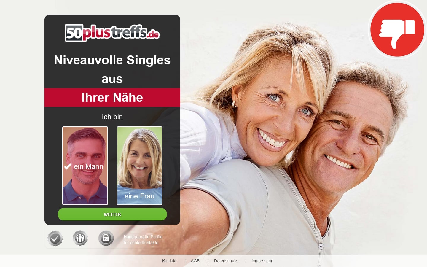 Eigenen Angaben zufolge kann man sich auf 50Plus-Treffs.de mit reifen und niveauvollen Singles aus der eigenen Umgebung zu aufregenden Dates verabreden. Das Dating Portal wirbt mit zahlreichen hand- geprüften Mitgliedern und einer sowohl unkomplizierten, als auch kostenlosen Anmeldung. Um etwas mehr über die Seite in Erfahrung zu bringen, melden wir uns probeweise an, betreiben etwas Recherche im Netz und lesen uns die Nutzungsbedingungen durch. Ein kurzer Blick ins Impressum der Seite reicht jedoch bereits aus, um zu erkennen, dass es sich hier um eine Abzocke handelt.