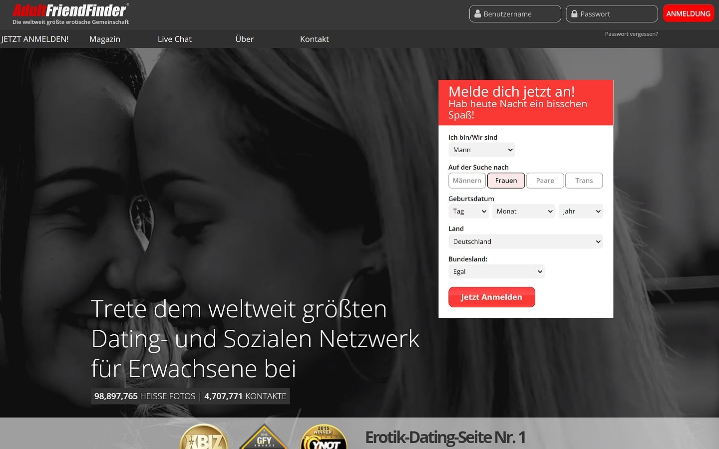 Die Online-Dating-Seite AdultFriendFinder.com ist mit mehr als zwei Millionen Usern in Deutschland eine der vielversprechendsten Plattformen für erotische Kontakte. Hier kommt man schnell ins Gespräch mit anderen Nutzern. Und selbst falls einem gerade nicht nach Chatten und Daten ist, kann man sich von dem umfangreichen Angebot der Seite berieseln lassen. Wie bereits mehrfach in diesem Bericht erwähnt, bietet die Webseite viel mehr an als nur die Partnersuche nach einem unverbindlichen Date. Trotz des umfangreichen Angebots bietet die Plattform immer noch sehr hohe Chancen auf ein Date.