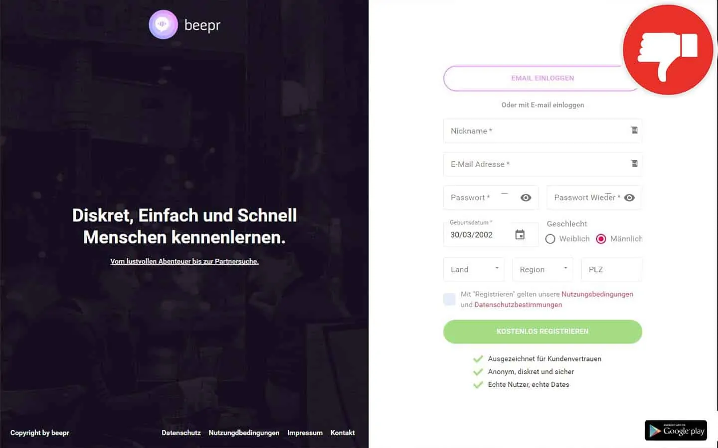 Die Online-Dating-Webseite Beepr.de wirbt mit einer kostenlosen Anmeldung und verspricht spannende Unterhaltung. Hier soll man schnell und einfach neue Menschen kennenlernen. Die Startseite wirbt mit dem Slogan: „Vom lustvollen Abenteuer bis zur Partnersuche.“. Wir haben etwas Recherche über die Seite betrieben und herausgefunden, dass es sich um eine Abzocke durch einen Fake Chat handelt. Die Startseite bietet uns nicht sehr viele Informationen über die Kosten und Leistungen, daher haben wir uns die AGB der BEAL UG etwas genauer angesehen. Die BEAL UG hat ihren Sitz in Flensburg, Deutschland. Der Norden von Deutschland ist der Hotspot für Fake Chat Abzocke Dating Seiten hierzulande.