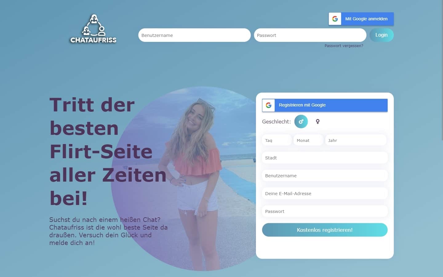 Das Design der Startseite von ChatAufriss.com wirkte auf mich direkt ansprechend und einladend. Neben dem Anmeldefeld konnte ich das Bild einer lächelnden jungen Frau sehen, was wohl einen freundlichen ersten Eindruck vermitteln sollte. Zudem wurde mir die „beste Flirt-Seite aller Zeiten“ versprochen. Jedoch vermisste ich auf den ersten Blick detaillierte Informationen zur Nutzung und den Funktionen der Seite, was für Neulinge vielleicht abschreckend wirken könnte.
