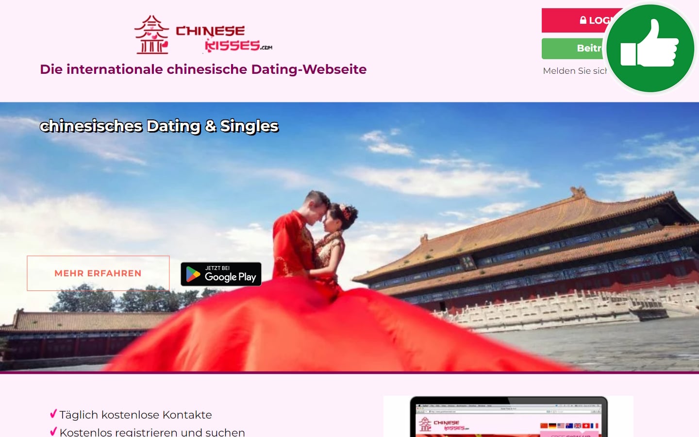 Bei ChineseKisses.com handelt es sich um eine internationale Dating Plattform, die sich auf die Vermittlung von chinesischen Singles spezialisiert. Bei unseren Recherchen konnten wir keinerlei Hinweise auf eine Abzocke finden. Das Portal macht auf uns einen durchweg positiven Eindruck. Dementsprechend spricht nichts dagegen, hier einfach mal sein Glück zu versuchen.