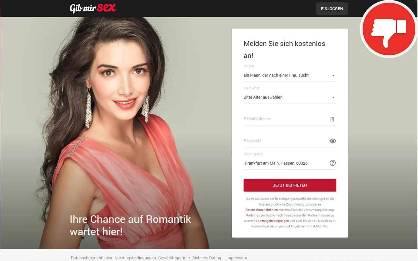 Das Dating Portal GibMirSex.com wirbt mit einer kostenlosen Anmeldung und verspricht Romantik pur. Das klingt im Prinzip verlockend, allerdings ist die Seite nicht das, was sie vorgibt, zu sein. Es handelt sich um eine Abzocke durch eine Abo-Falle. Es gibt gleich mehrere Hinweise darauf, dass die Seite nicht zu empfehlen ist. Die AGB sind ausschließlich in englischer Sprache vorhanden und die Betreiberfirma heißt GibMirSex. Das hinterlässt bei uns den Eindruck, dass es sich um eine Scheinfirma handelt. Zudem hat die Firma ihren Sitz im Ausland. Im Netz ist die Seite bekannt. Es wird vor einer Anmeldung gewarnt.