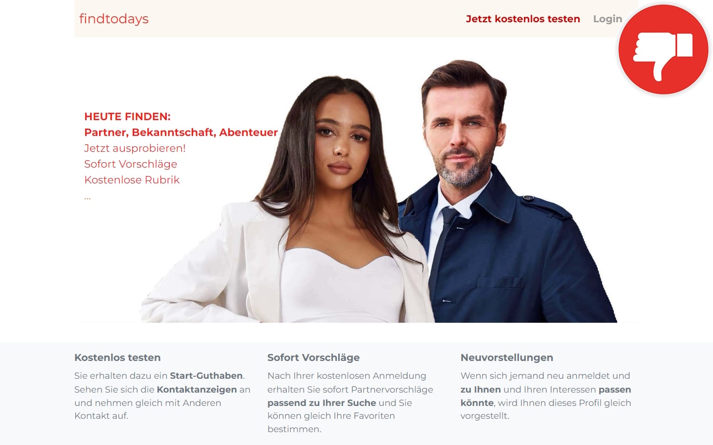 Die Online-Datingseite FindTodays.com macht einen soliden Eindruck. Auf der Startseite sehen wir einige Profilbilder, welche weibliche und männliche Personen zeigen. Außerdem wirbt die Seite mit einer kostenlosen Anmeldung. Unsere Recherche zeigt, dass die Angaben auf der Startseite nicht ganz korrekt sind. Das Portal wirbt bewusst mit irreführenden Informationen. Die falschen Angaben sind der erste Schritt der Abzocke. Nach der Registrierung fallen Kosten für die Nutzung an. Des Weiteren sind die Profile der Seite ein Fake. Das trifft auf die Profile auf der Startseite als auch auf die im Mitgliederbereich zu. Demnach sind alle Profile der Seite ein Fake.