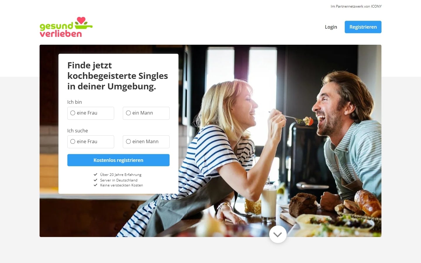 Sehr übersichtlich und umfangreich gestaltet ist die Startseite der Gesund-Verlieben.de Datingseite. Kochbegeisterte Singles aus der eigenen Umgebung werden mir auf der Seite versprochen. Unter der Möglichkeit, mich zu registrieren, kann ich dabei auch erste Informationen zu der Nutzung der Seite finden. So wird neben einem Fotoflirt auch ein Frageflirt angeboten. Die Betreiber legen zudem einen großen Wert auf Sicherheit. Zudem finde ich einige Erfolgsgeschichten von ehemaligen Nutzern. Dies vermittelt alles einen sehr guten Eindruck. Die Startseite ist transparent gestaltet und eine Registrierung scheint sich zu lohnen.