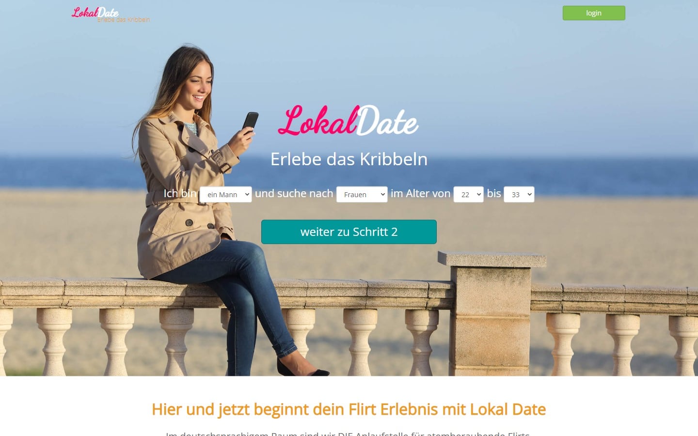 Die Startseite von Lokal-Date.de ist übersichtlich gestaltet. Es ist eine einzelne junge Frau zu sehen, die ihr Mobiltelefon bedient. Das Portal wirbt damit, mir atemberaubende Flirts vermitteln zu können. Die Webseite ist für Personen zugänglich, die ihren Wohnsitz in Deutschland, Österreich oder der Schweiz haben. Im unteren Bereich sind bereits die Profilbilder mehrerer weiblicher Nutzer abgebildet. Jedoch kann man die Profile hier leider noch nicht öffnen. Im Vergleich zu anderen Portalen wird auch ausdrücklich damit geworben, dass es keine versteckten Kosten sowie Abofallen gibt.