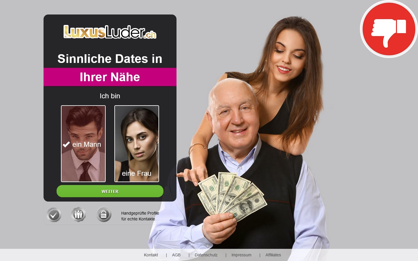 LuxusLuder.ch wirbt mit „sinnlichen Dates“ und hand-geprüften Profilen für echte Kontakte. Auf den ersten Eindruck wirkt die Seite zwar etwas unspektakulär, aber durchaus vertrauenswürdig. Um herauszufinden ob sich eine Anmeldung auch wirklich lohnt, betreiben wir etwas Recherche im Internet und lesen die AGB in Ruhe durch. Außerdem erstellen wir ein kostenloses Testprofil und sehen uns die angebotenen Features und den Mitgliederbereich etwas genauer an. Bedauerlicherweise stoßen wir dabei schnell auf einige Informationen, die LuxusLuder.ch als eine Abzocke enttarnen.