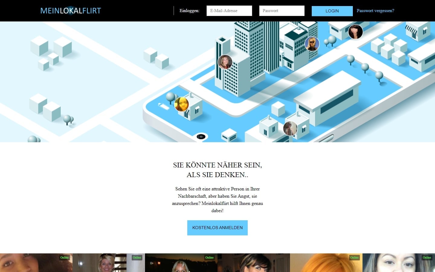 Die Startseite der MeinLokalFlirt.com Datingseite ist sehr einfach, aber durchaus modern gestaltet. Ich finde im oberen Bereich der Seite die Möglichkeit, mich anzumelden. Darunter lese ich, dass es hier um neue Kontakte aus der direkten Umgebung gehen soll. Einige Profilbilder der hier angemeldeten Mitglieder werden mir ebenfalls bereits angezeigt.