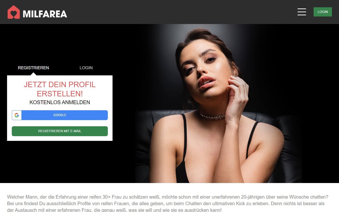 MilfArea.com ist ein Portal, welches an Frauen und Männer ab 21 Jahren gerichtet ist. Es bietet speziell Kontakte zu reiferen Frauen ab 30 Jahren für unterhaltsame und angeregte Chats. Die Webseite ist in diversen Sprachen abrufbar und bewirbt sich damit vielfältigen Kontakt zu Frauen weltweit zu ermöglichen. Auch Nutzer, welche an gleichgeschlechtlichen Kontakten interessiert sind, können hier nach einem geeigneten Partner suchen.
