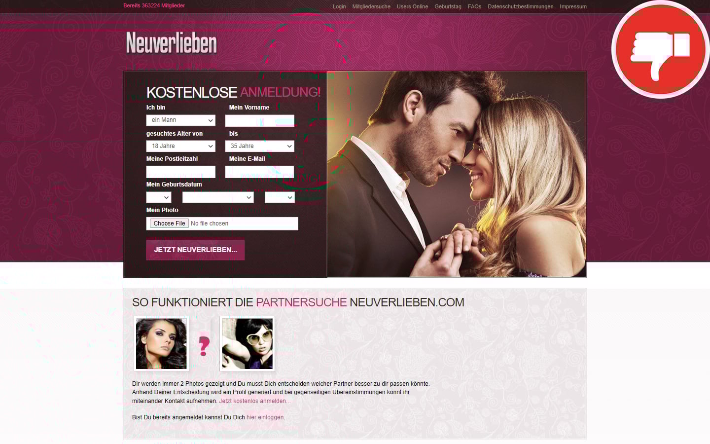 Die Dating Seite NeuVerlieben.com wirbt mit einer kostenlosen Anmeldung und einer kreativen Art der Partnersuche. Dabei kann man sich der Reihe nach zwischen zwei Profilfotos anderer Mitglieder entscheiden, dabei läuft man den Profilfotos mehrmals über den Weg. Das System der Seite ermittelt dann den Geschmack des Nutzers. Hat man selbst genug Stimmen von der anderen Person erhalten, kann man kostenfrei das Gespräch beginnen. Das bedeutet auch, dass die Nutzung der Seite oftmals mit Kosten verbunden ist.