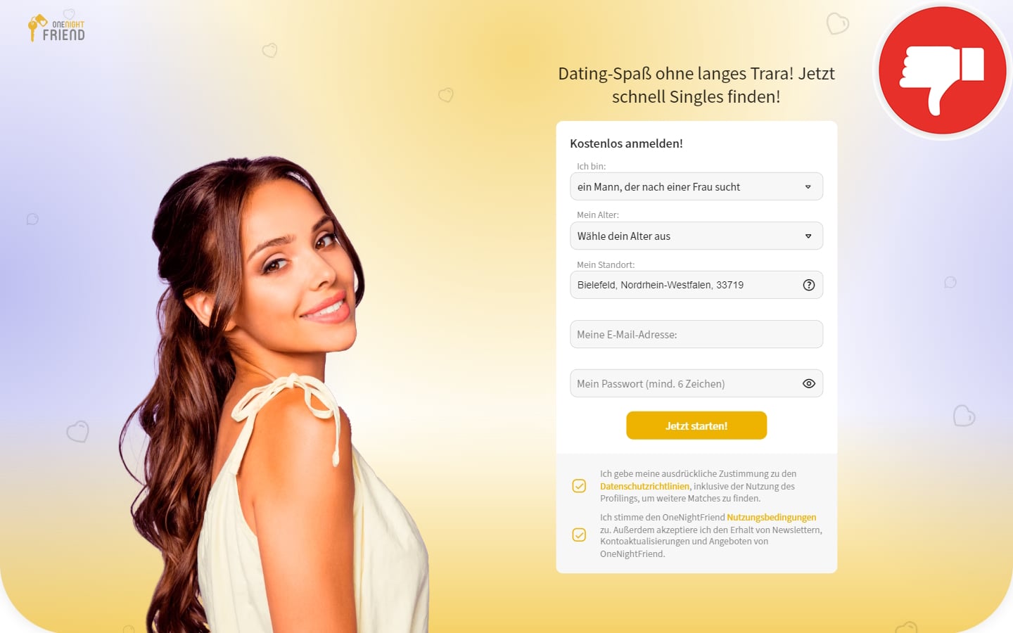 OneNightFriend.com wirkt auf den ersten Blick durchaus einladend und vielversprechend. Es scheint sich bei der Seite um eine moderne Plattform zu handeln, auf der man, schnell und unkompliziert, unverbindliche Dates verabreden kann. Um in Erfahrung zu bringen, ob sich eine Anmeldung lohnt, betreiben wir etwas Recherche. Leider stellen wir schnell fest, dass der positive erste Eindruck täuscht. Die Seite ist eine Abzocke.