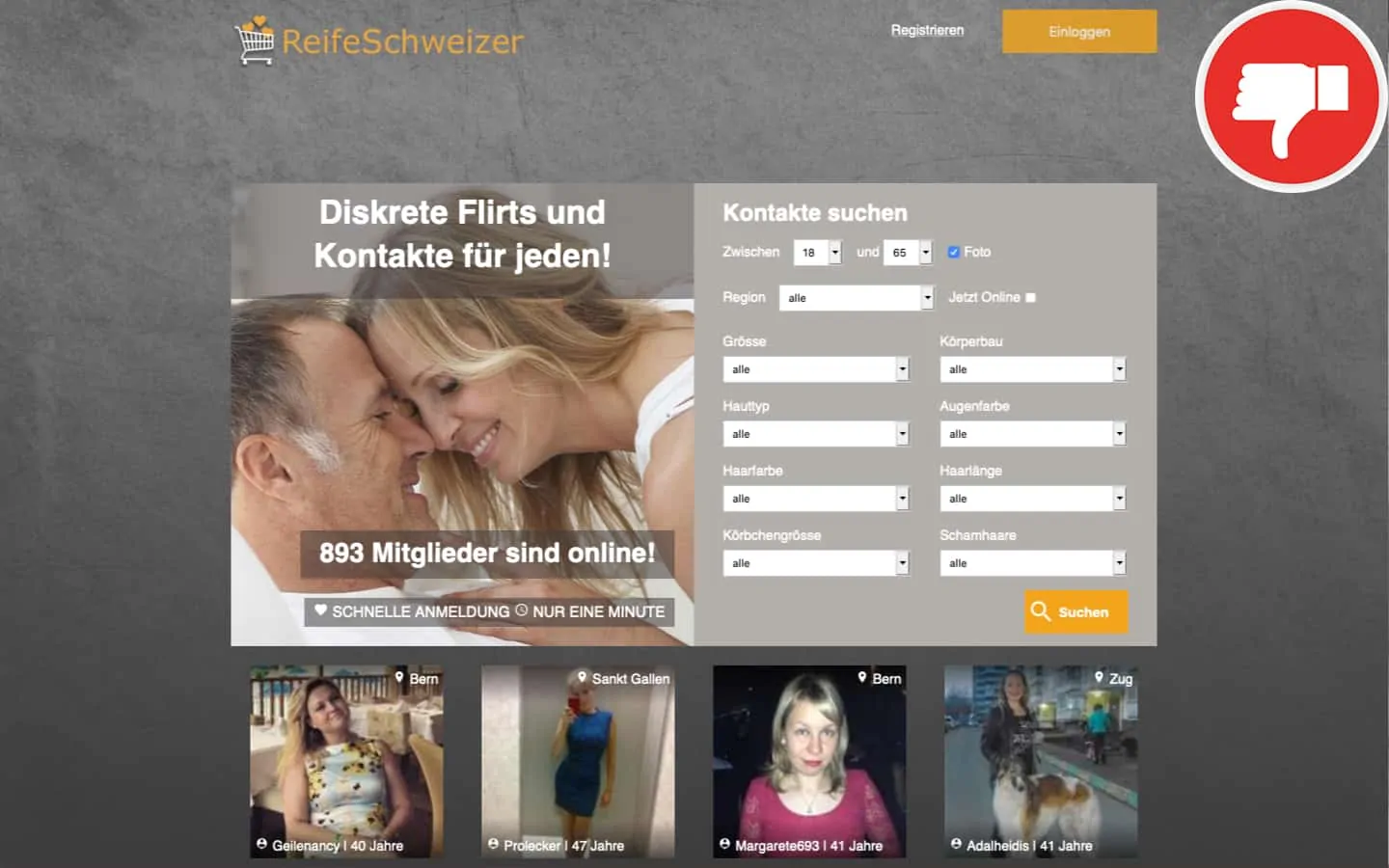 Das Online Dating Portal ReifeSchweizer.com richtet sich an die ältere Generation der Kontaktsuchenden. Auf der Seite soll es ein Leichtes sein, die passende Person für die große Liebe oder nur ein Date zu finden. Es wird mit einem großen Mitgliederbereich und einer kostenlosen Anmeldung geworben. Klingt alles in allem erst einmal sehr vielversprechend, allerdings stellt sich bei unserer Recherche schnell heraus, dass die Seite eine Abzocke ist. Im Internet häufen sich die negativen Erfahrungsberichte.