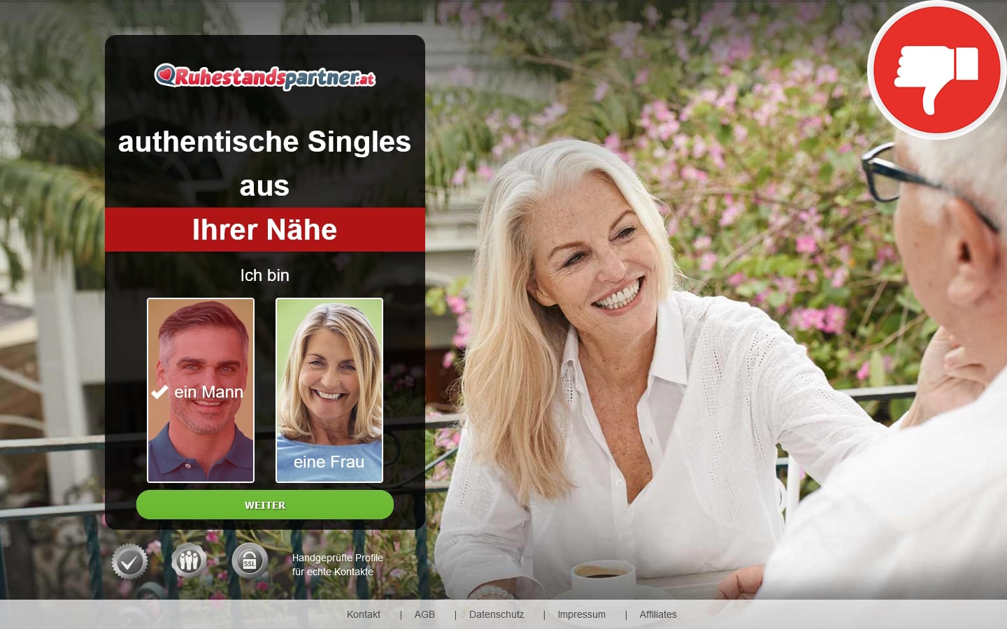 Für ältere Singles aus Österreich will die RuhestandsPartner.at Datingseite eine gute Anlaufstelle sein, um neue Bekanntschaften zu finden. In unserem Test müssen wir leider die Erfahrung machen, dass sich hier keine realen Treffen organisieren lassen und stattdessen nur eine perfide Abzocke betrieben werden soll. Die Betreiber der Seite Date4Friend AG, die ihren Sitz in Zug in der Schweiz haben, nutzen die Naivität und vielleicht auch Hoffnungslosigkeit älterer Menschen schamlos aus und wollen sie so zum Abschluss eines Abos drängen.