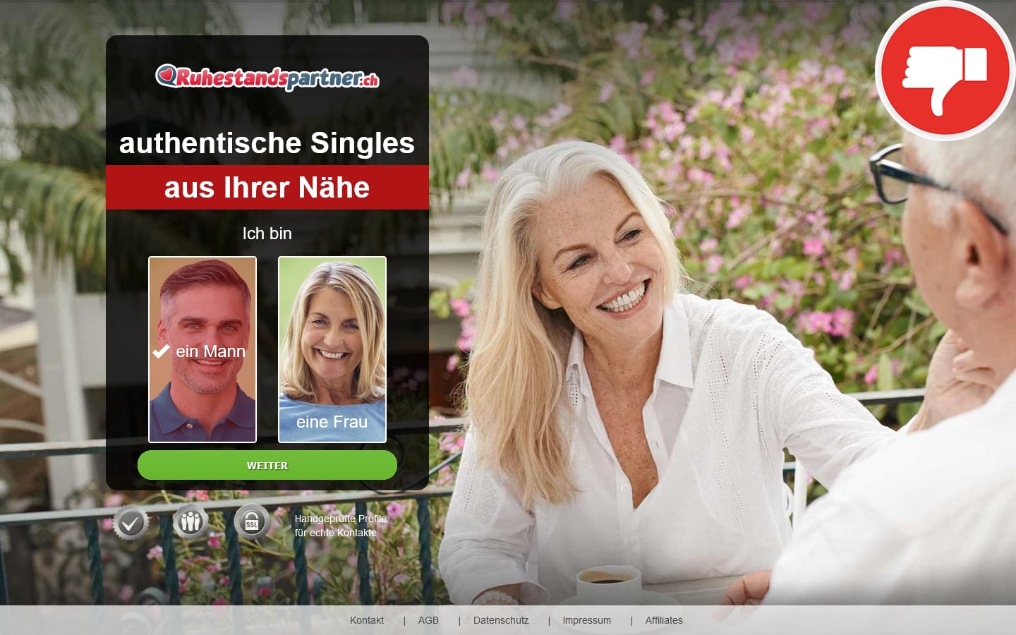 RuhestandsPartner.ch versprach anfänglich, dass man hier im Alter noch einmal sein Glück finden kann. Auf einem Portal, auf dem alles nicht richtig zu funktionieren scheint, abgesehen von der Bezahlseite, kann dieses Versprechen eindeutig nicht eingehalten werden. In einem Radius von 1000 km wurden uns gerade mal zwei User angezeigt, bei denen es sich unserer Erfahrung nach um keine echten Nutzer handeln kann. Finger weg von dieser Abo-Abzocke.