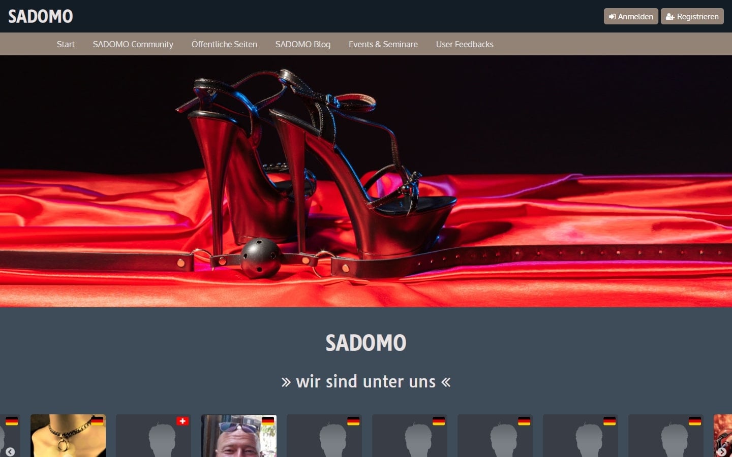 Die Startseite der Sadomo.de Plattform ist recht einfach und nicht allzu modern gestaltet. Hier wird mir zunächst das Motto der Webseite „Wir sind unter uns“ angezeigt. Darunter sehe ich einige Profilbilder der hier angemeldeten Nutzer. Genauer anschauen kann ich mir die Profile ohne eine Registrierung noch nicht. Zudem erhalte ich einige einführende Informationen. Ich kann nachlesen, dass sich die Webseite an BDSM- und Fetisch-Interessierte Personen richtet. Dabei soll jeder willkommen sein. Die Nutzung der Webseite soll zudem kostenfrei sein. Insgesamt macht die Startseite einen recht ordentlichen Eindruck.