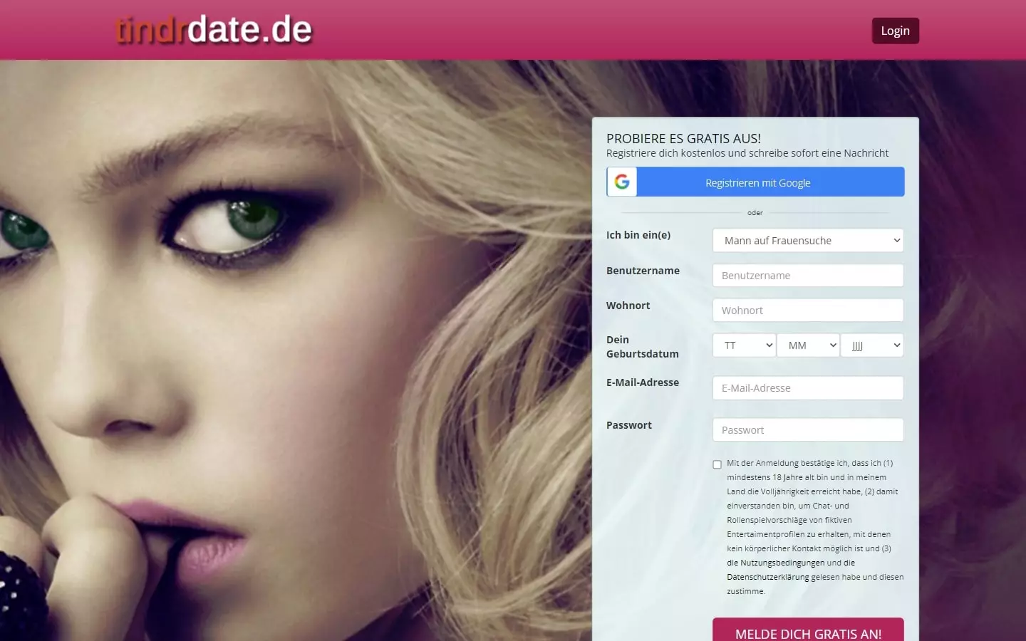 Neben eines ausführlichen Anmeldefelds bekomme ich auf der Startseite der TindrDate.de-Datingseite das Bild einer jungen Frau angezeigt. Hier soll mich ein soziales Netzwerk erwarten, auf dem ich neue Bekanntschaften und Abenteuer finden kann. Die Startseite wirkt dabei sehr modern und gut gestaltet. Eine Registrierung ist dabei kostenlos möglich. Im Kleingedruckten bekomme ich dann noch zu lesen, dass mich auf der Seite auch fiktive Profile erwarten werden. Dadurch sind reale Kontakte nicht wirklich möglich. Ich soll mich hier nur virtuell unterhalten.